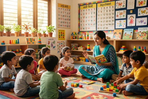 A joyful environment where children learn basic skills through fun activities, storytelling, and interactive learning.